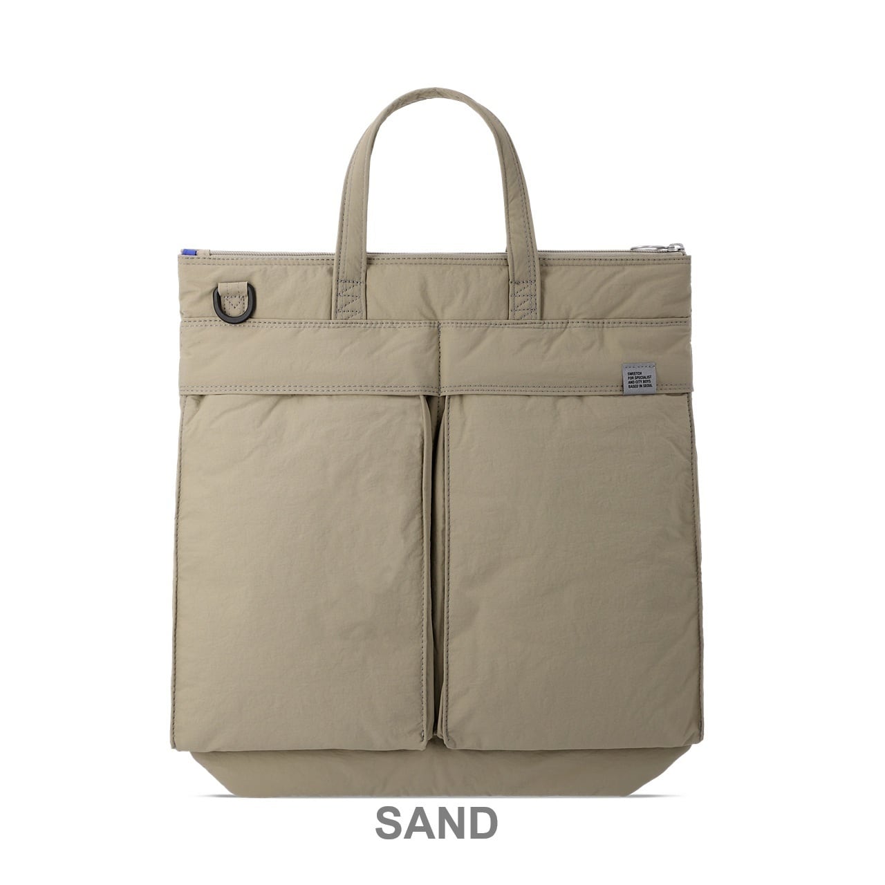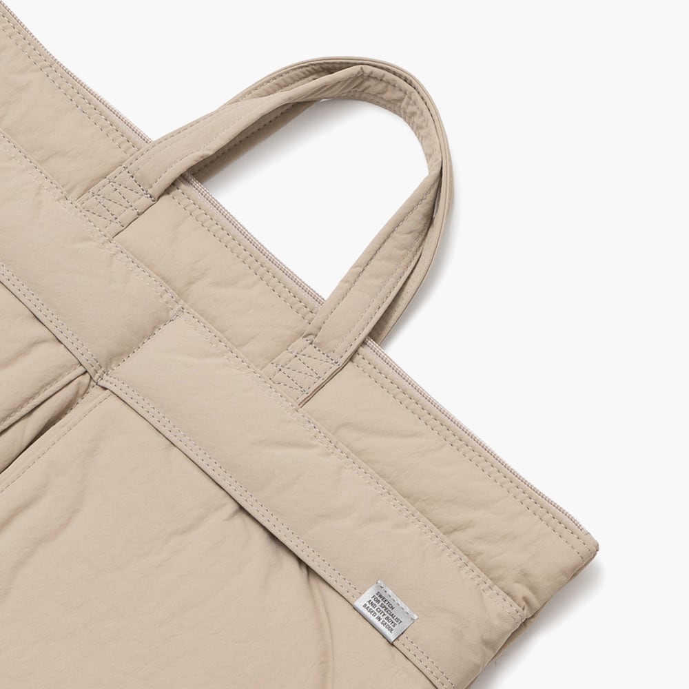 ・都市のエッセンスを取り入れたデザイン。マットな斜め織りナイロン素材、漢江の橋をモチーフにしたジグザグステッチ、都市という舞台を航海する “青春”をイメージしたブルーの裏地が特徴です。