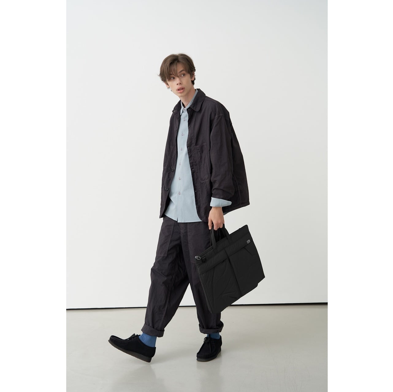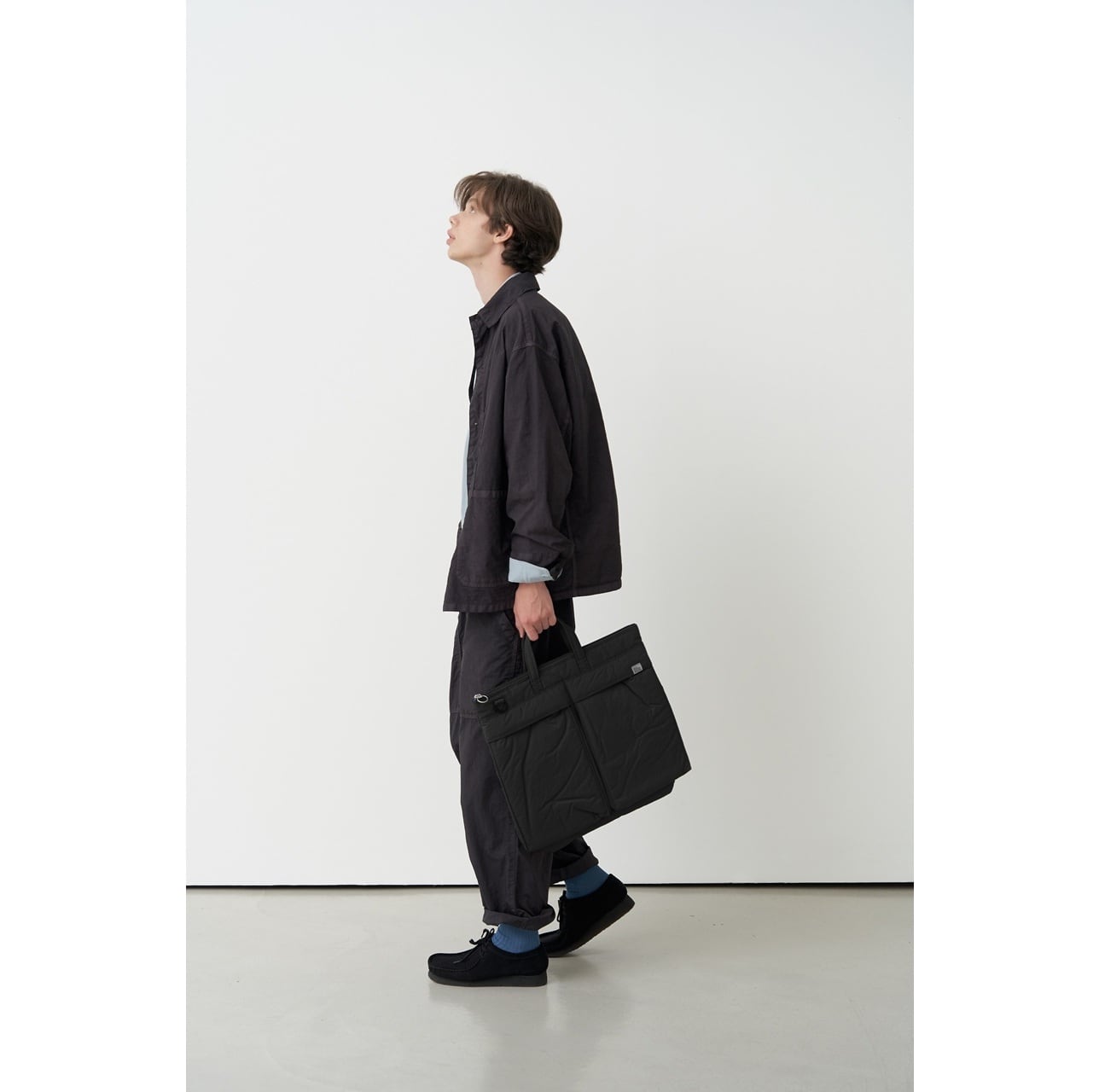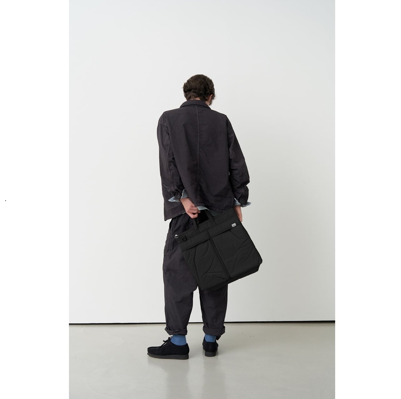 ・生活防水仕様のマットな素材で、ほどよくカサっとした風合いと、ふっくらしたシルエット、やわらかな質感がポイント。